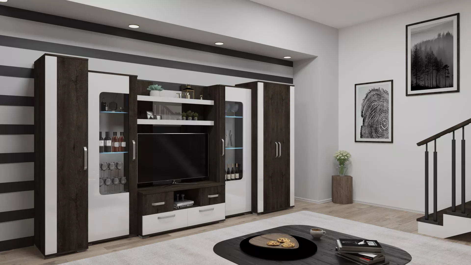 A nappali egyik központi eleme a szekrénysor. Sokoldalúsága kialakításában rejlik. Egyaránt helyet kap benne a televíziókészülék, emlék- vagy dísztárgyaink, valamint ruhák, könyvek, illetve akár fontosabb irataink is. Széles választékunk egyik igazán közkedvelt darabja az Adél modern kivitelű szekrénysor látványos LED világítással, valamint magasfényű betéttel. Rendelkezik  polcos, fiókos és akasztós részekkel. A termék 18 mm-es laminált forgácslapból készül, a lapok ABS élzárással vannak ellátva.  A termék elemenként készre szerelve kerül kiszállításra.