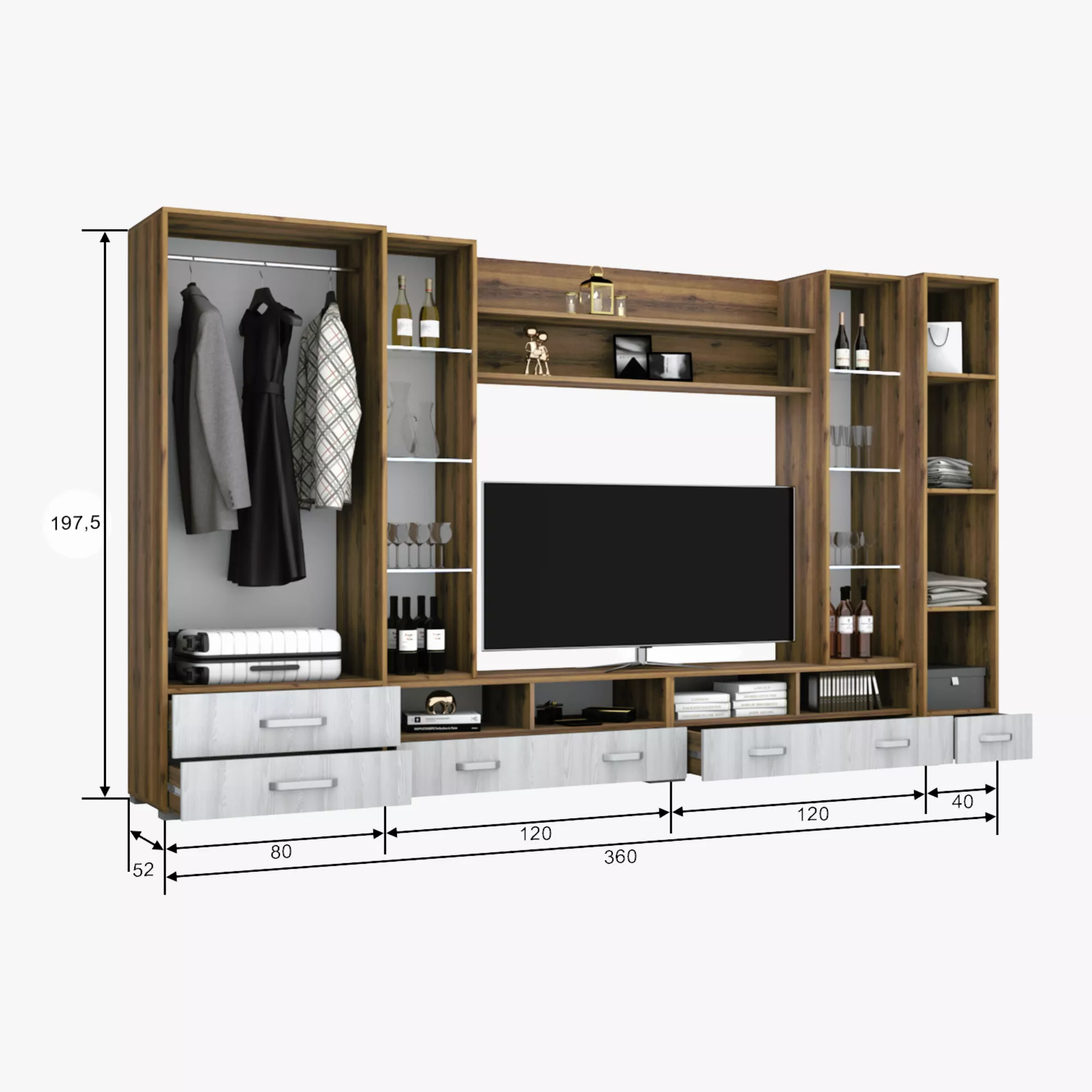 A nappali egyik központi eleme a szekrénysor. Sokoldalúsága kialakításában rejlik. Egyaránt helyet kap benne a televíziókészülék, emlék- vagy dísztárgyaink, valamint ruhák, könyvek, illetve akár fontosabb irataink is. Széles választékunk egyik igazán közkedvelt darabja az Anubis modern kivitelű szekrénysor látványos LED világítással. Rendelkezik polcos, fiókos és akasztós részekkel. A termék 18 mm-es laminált forgácslapból készül, a lapok ABS élzárással vannak ellátva. A termék elemenként készre szerelve kerül kiszállításra.