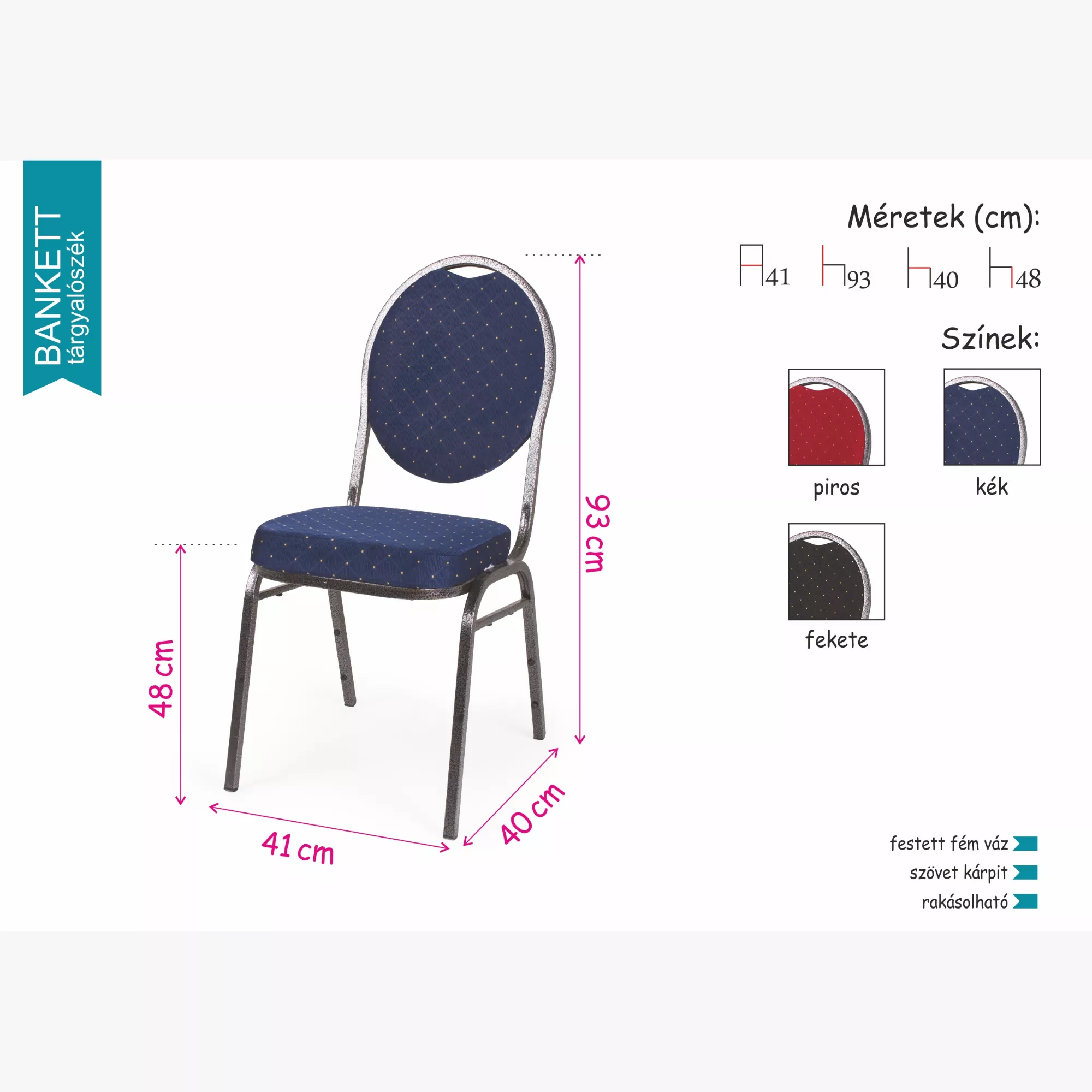 A Bankett tárgyalószék kiválóan alkalmas konferenciákra, illetve dísztermekbe, rendezvényekre, esküvőkre. A szövetből készült ülőfelület és a háttámla is nagyon kényelmes. Rakásolható, tehát szükség esetén akár nagyszámú szék tárolható kis helyen. Stabil lába festett fém, ami praktikus és könnyen tisztán tartható.