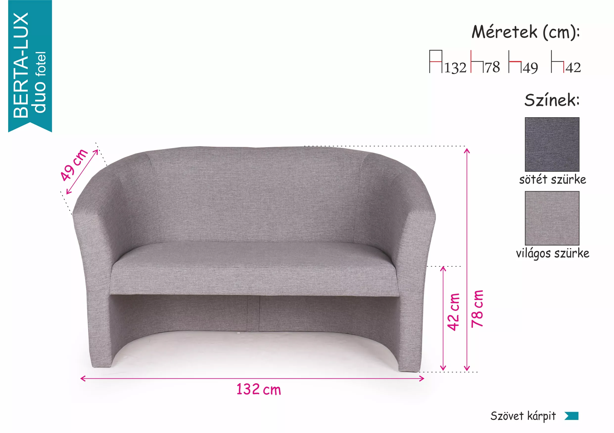 Fedezd fel a stílusos és kényelmes Berta-Lux Duo Fotel kínálatát! Ez a kétszemélyes ülőalkalmatosság rendkívül kényelmes és pihentető. A szövetborítás pedig kellemes tapintást és elegáns megjelenést kölcsönöz. A Berta-Lux Duo fotel tökéletes társ lesz a pihenéshez, olvasáshoz vagy egy kellemes beszélgetéshez a partnereddel. Tedd különlegessé a belső teret ezzel a bájos ülőbútorral, ami nemcsak szép, de kényelmes is. Élvezd a pillanatokat a Berta-Lux Duo fotelben, mely harmonikusan ötvözi a stílust, kényelmet és funkcionalitást!