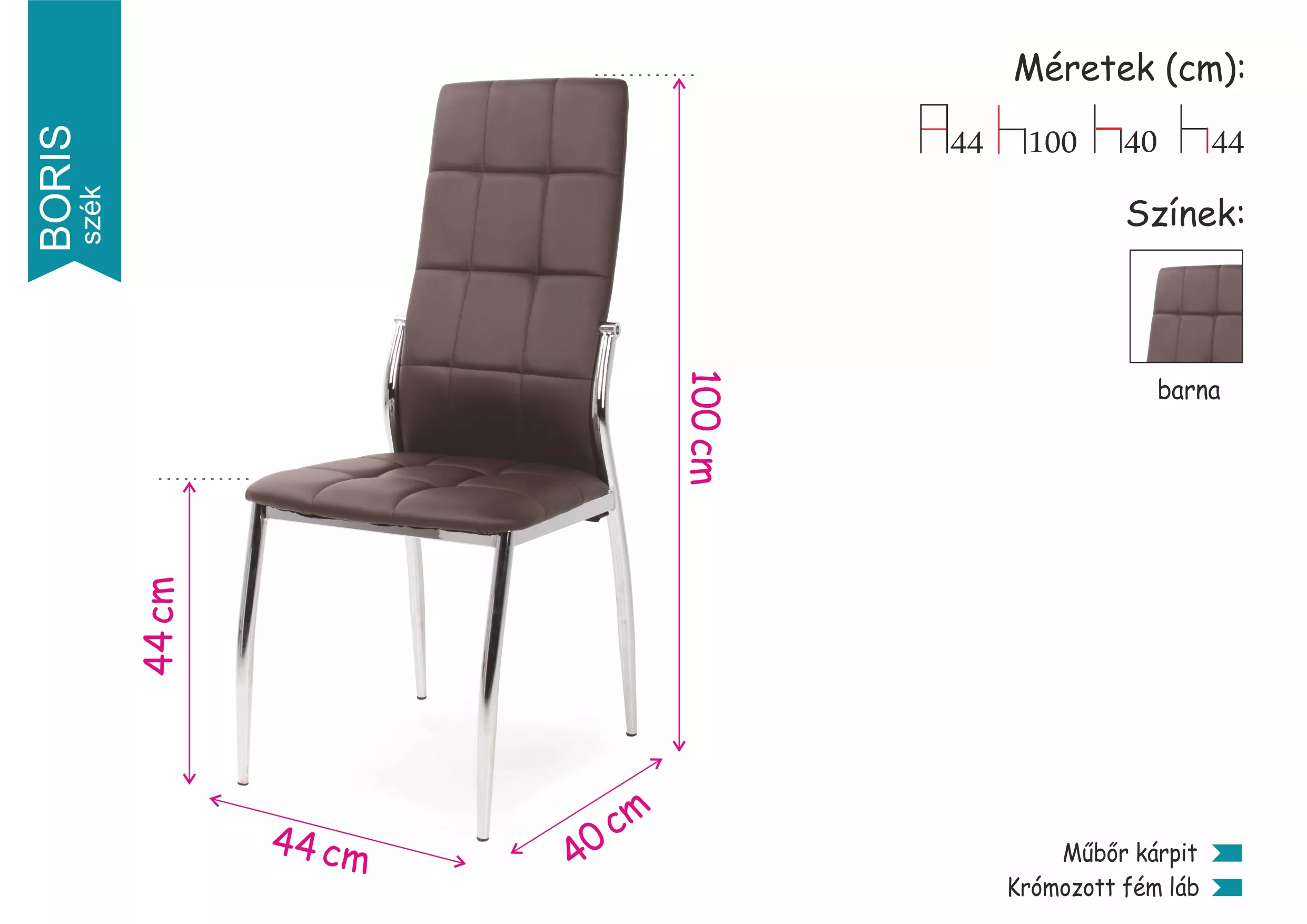 A Boris szék szövet kárpitjával és krómozott fém lábaival egyszerre biztosítja az elegáns megjelenést és a kényelmes étkezést. Az igényes tereket, a korszerű megoldásokat kedvelők számára egyaránt javasolt, korosztálytól függetlenül.