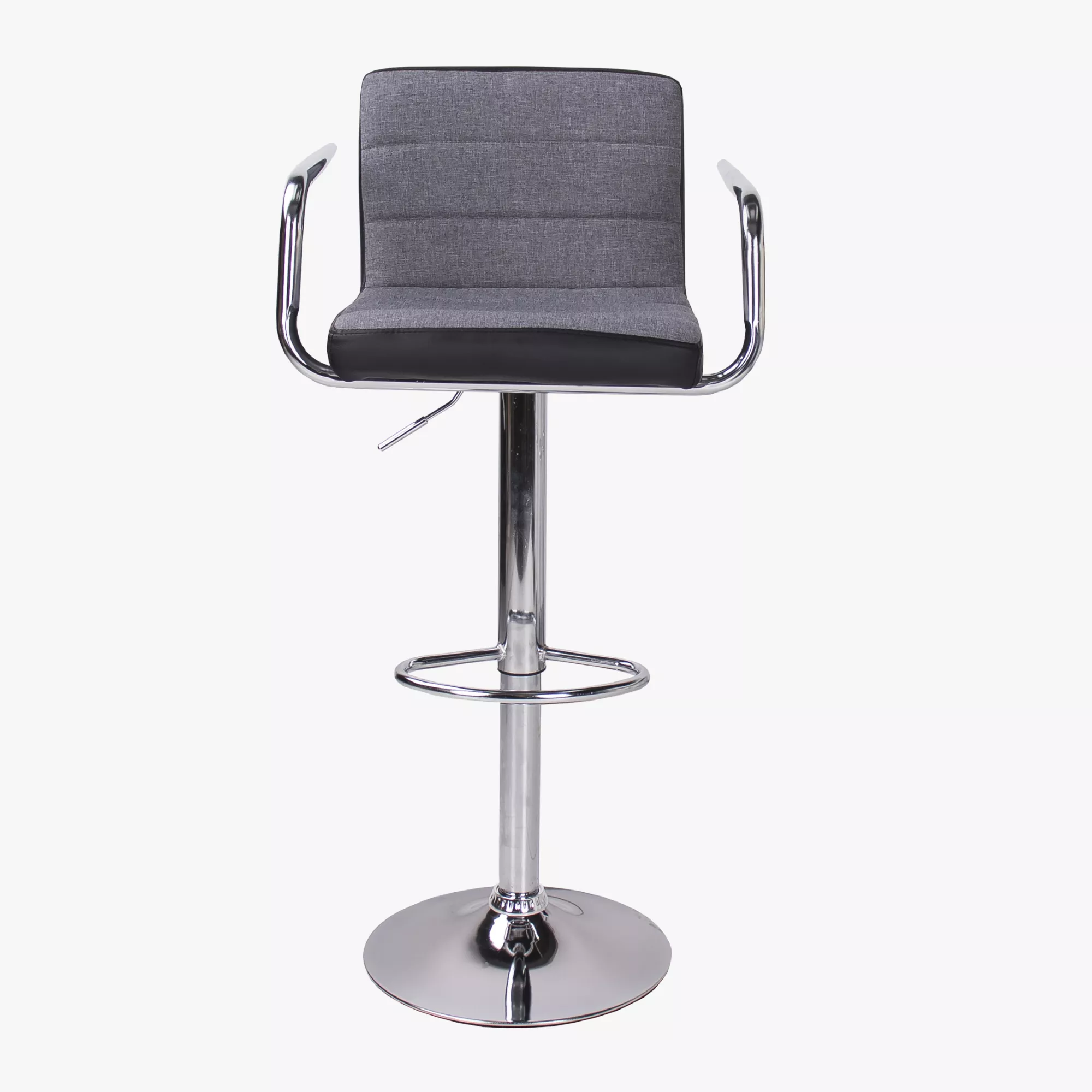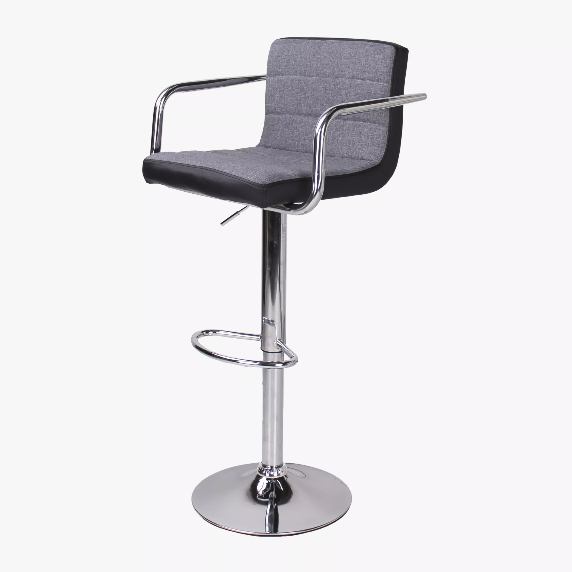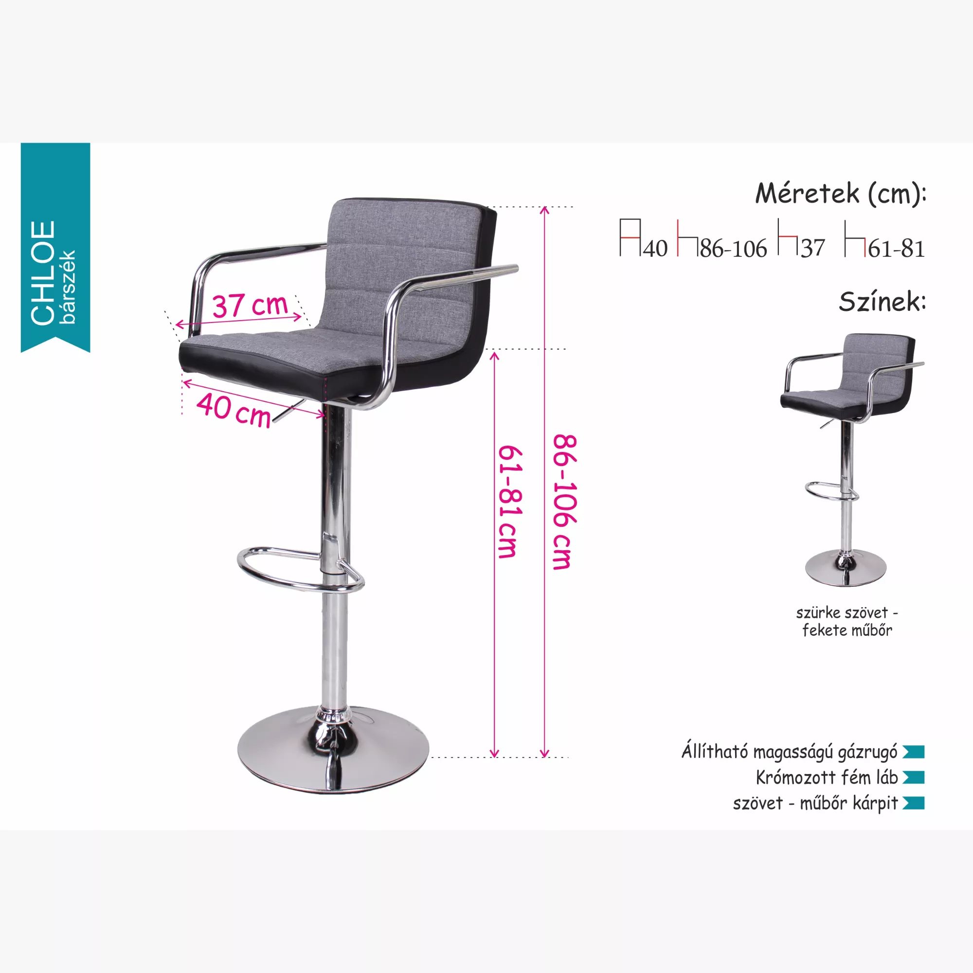 A Chloe bárszék szürke szövet - fekete műbőr kárpit kombinációban készült, ezáltal a legtöbb lakberendezési stílusba beilleszthető. Az elegáns, krómozott fém láb és kartámasz modern külsőt kölcsönöz neki, emellett a tökéletes kényelmet is biztosítja. Állítható magasságú gázrugója segítségével könnyedén beállíthatjuk a számunkra leginkább megfelelő magasságot.