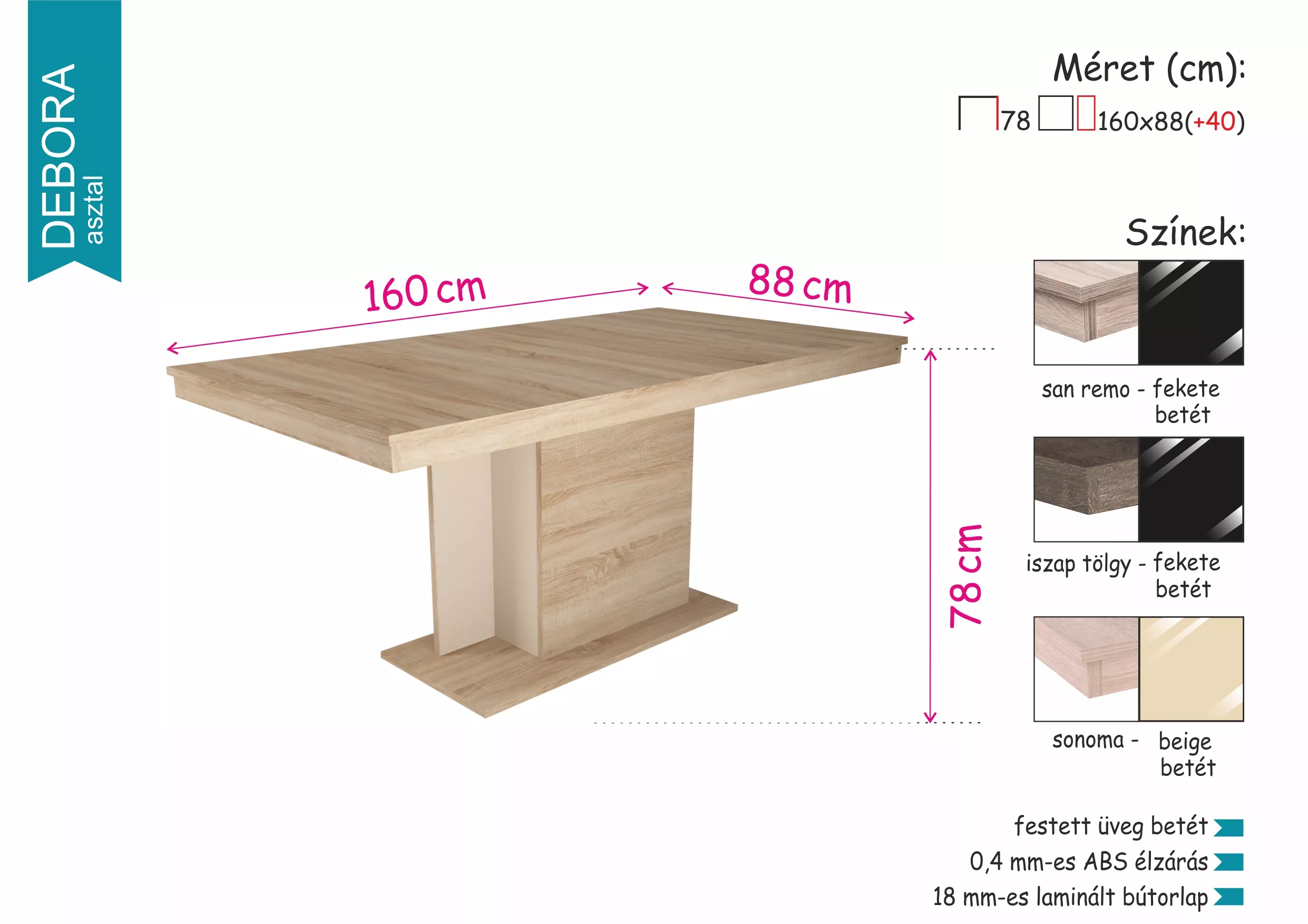 A laminált bútorlapból, magasfényű betéttel készült Debora asztal különleges megjelenését azoknak ajánljuk, akik a lakás berendezésénél is az eleganciát helyezik előtérbe. A sonoma asztalhoz beige, a san remo és iszap tölgy asztalszínekhez fekete magasfényű betét társul.