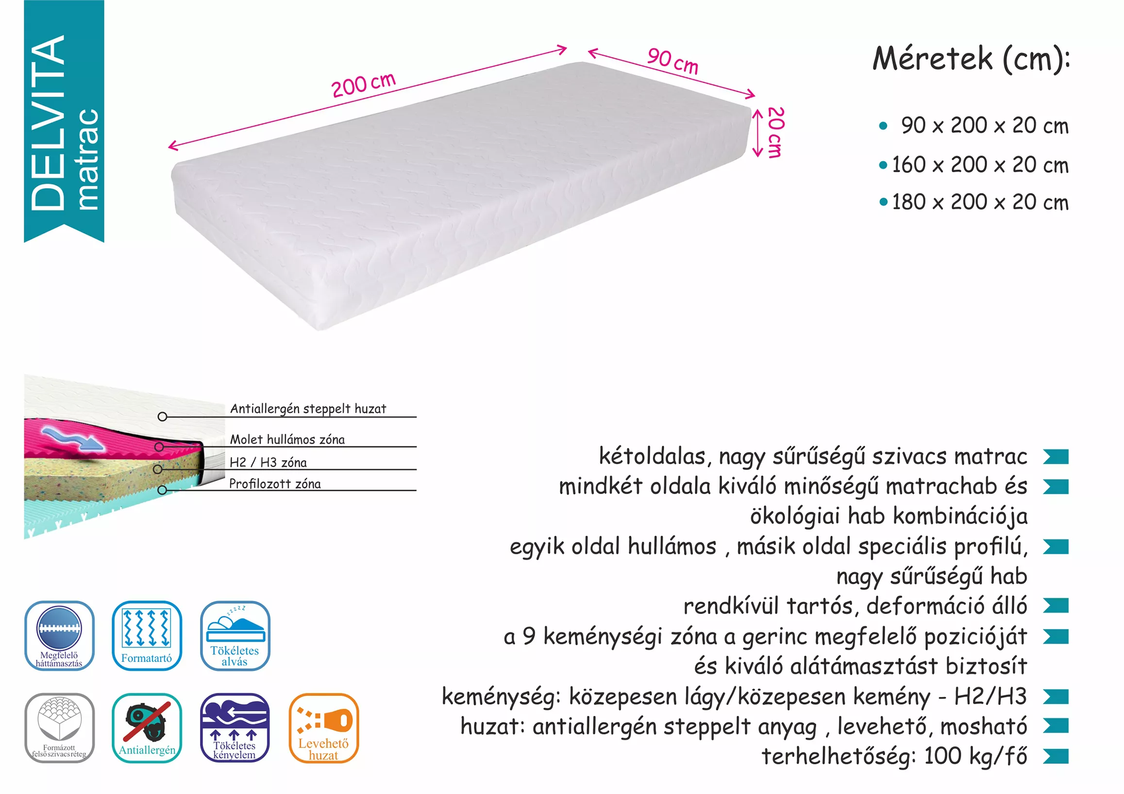 A Delvita kétoldalas, nagy sűrűségű szivacs matrac, melynek mindkét oldala kiváló minőségű matrachab és ökológiai hab kombinációja. Egyik oldala hullámos, másik oldala speciális profilú, nagy sűrűségű hab. Rendkívül tartós, deformáció álló. A 9 keménységi zóna a gerinc megfelelő pozícióját és kiváló alátámasztást biztosít. Keménysége: közepesen lágy / közepesen kemény - H2/H3. A huzat antiallergén steppelt anyag, mely levehető és mosható. Terhelhetősége 100 kg/fő.