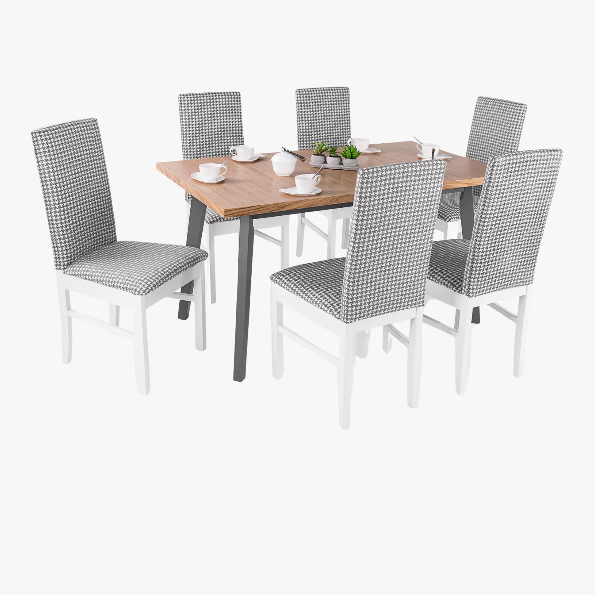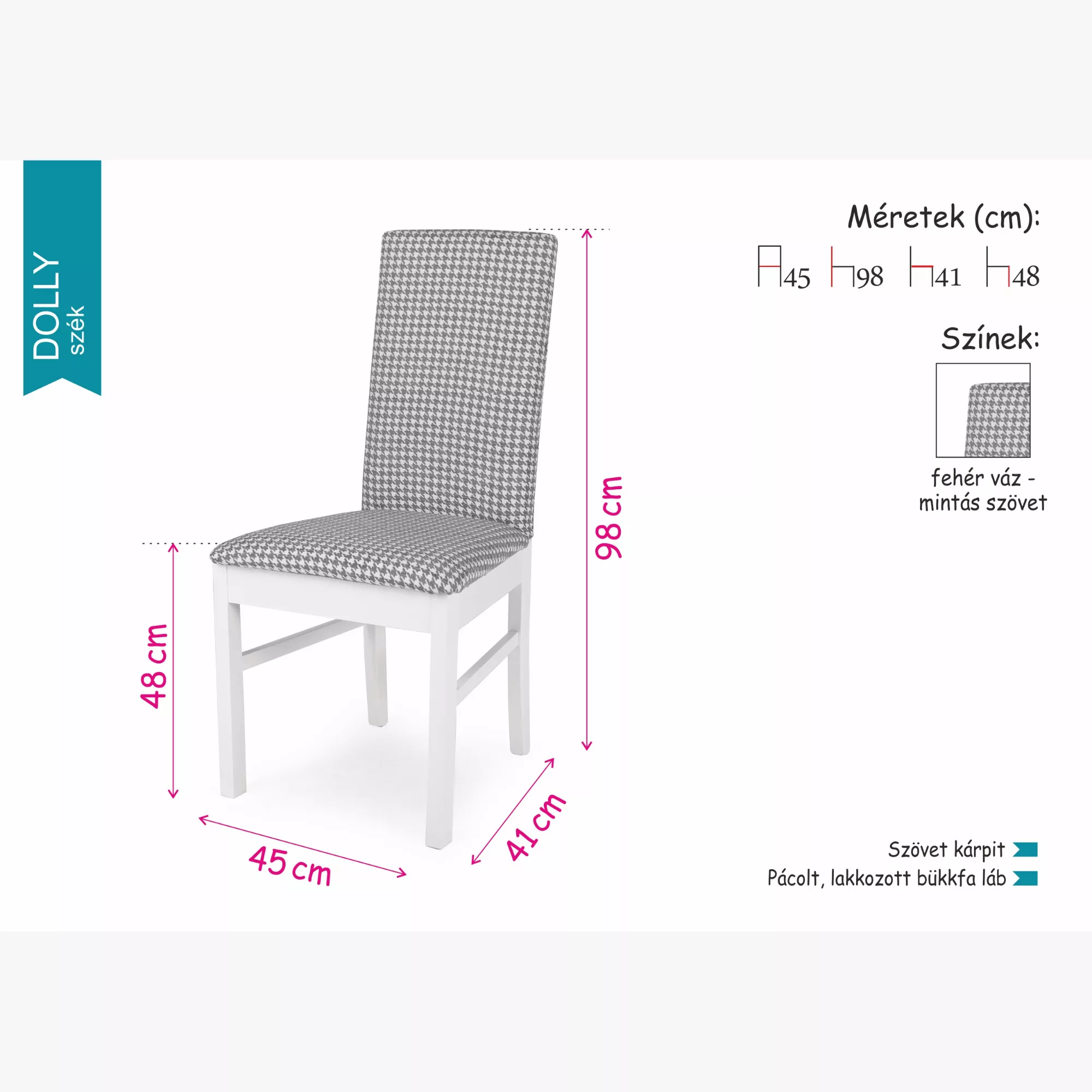 Igazán nagy kedvencünk a Dolly szék. Kitűnően mutat az egyszerű, klasszikus és a modern asztalokkal is. Pácolt, lakkozott bükkfa lábakkal, valamint fehér vázzal és mintás szövet kárpittal rendelkezik.