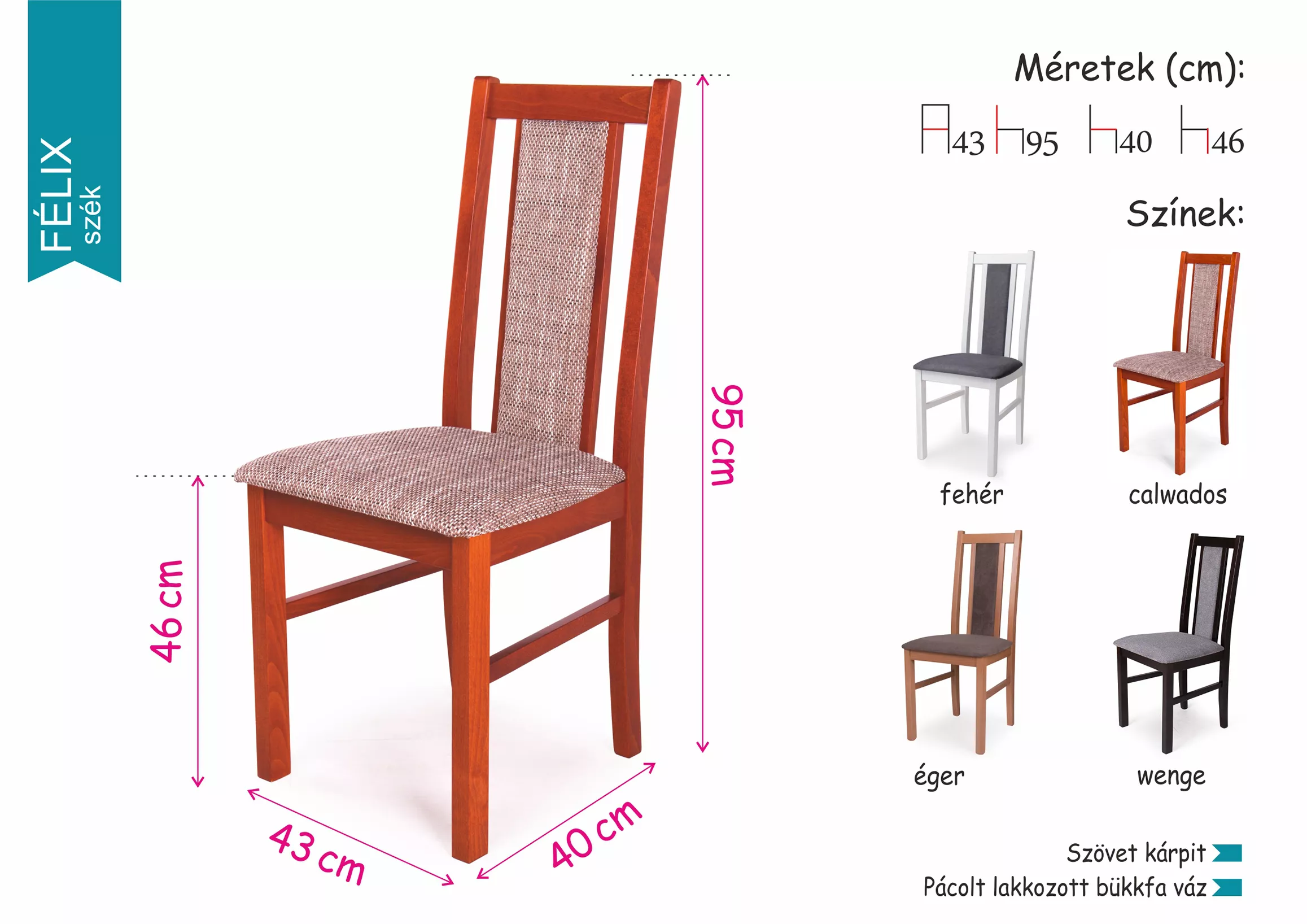 A pácolt, lakkozott bükkfa vázzal készült székek a természetes vonalat viszik közelebb az otthonához. A Félix szék szövet kárpitjával hozzájárul ahhoz, hogy stílusos, kényelmes és otthonos ülőfelületek álljanak rendelkezésre és garantálja az időtálló minőséget.