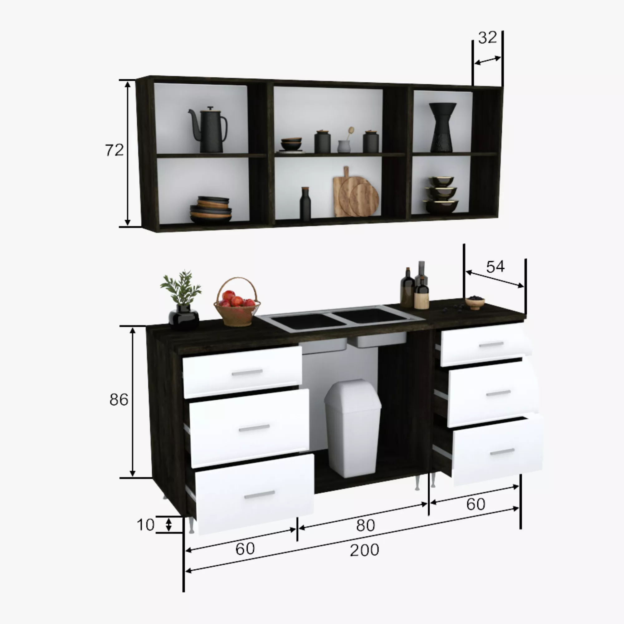 A korpusz 18 mm laminált forgácslap, ABS élfóliával zárva. A hátfal HDF lemez tűzőkapoccsal rögzítve. Az ajtó-, és fiókfront magasfényű fóliás bútorlap ABS élfóliával ellátva. A polcok alátámasztásai fém polctartóval, a fiókok teljes kihúzású fióksínnel vannak ellátva. A munkalap 38 mm, mérsékelten hő- és vízálló. A mosogatótálca ( dupla mély gyárilag ) rozsdamentes, szifonnal, lefolyóval. A mosogatótálca helyét, valamint a csaptelepet a helyszínen kell bele vágni.