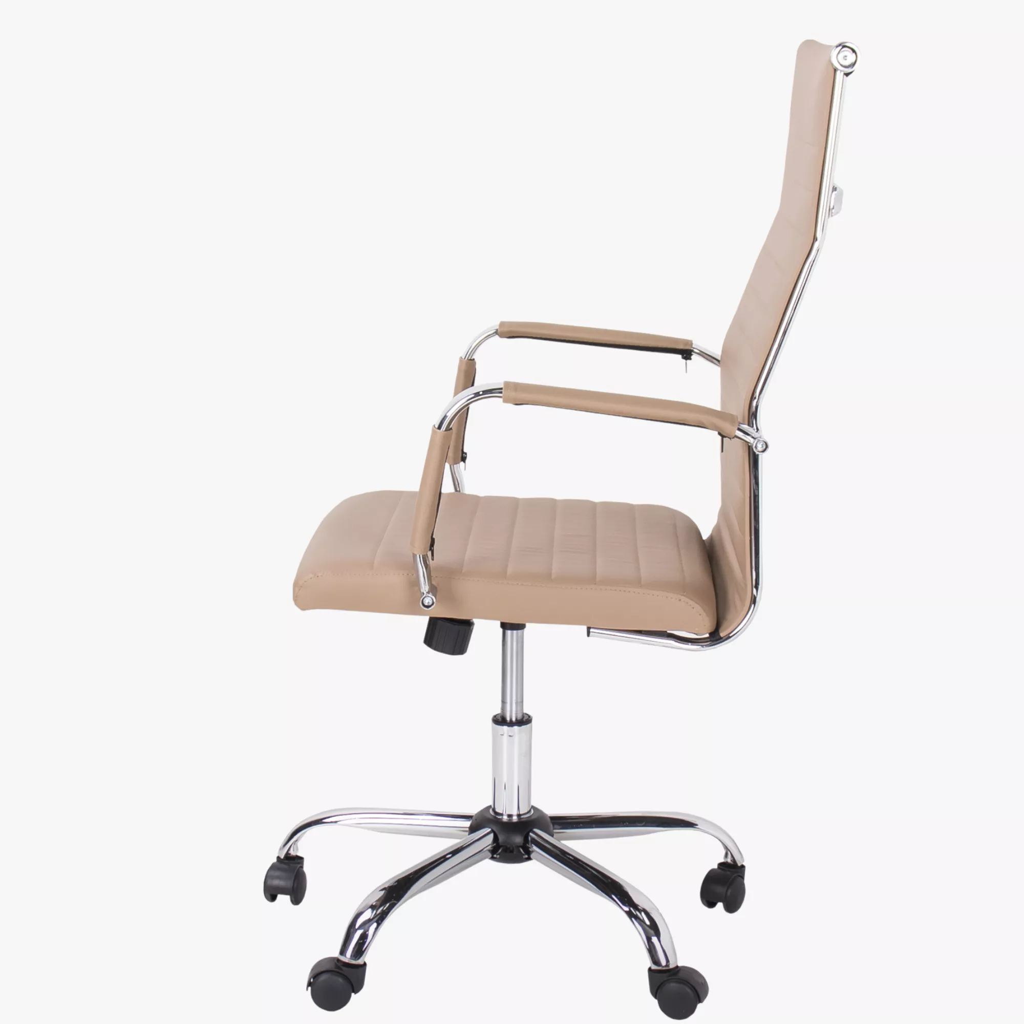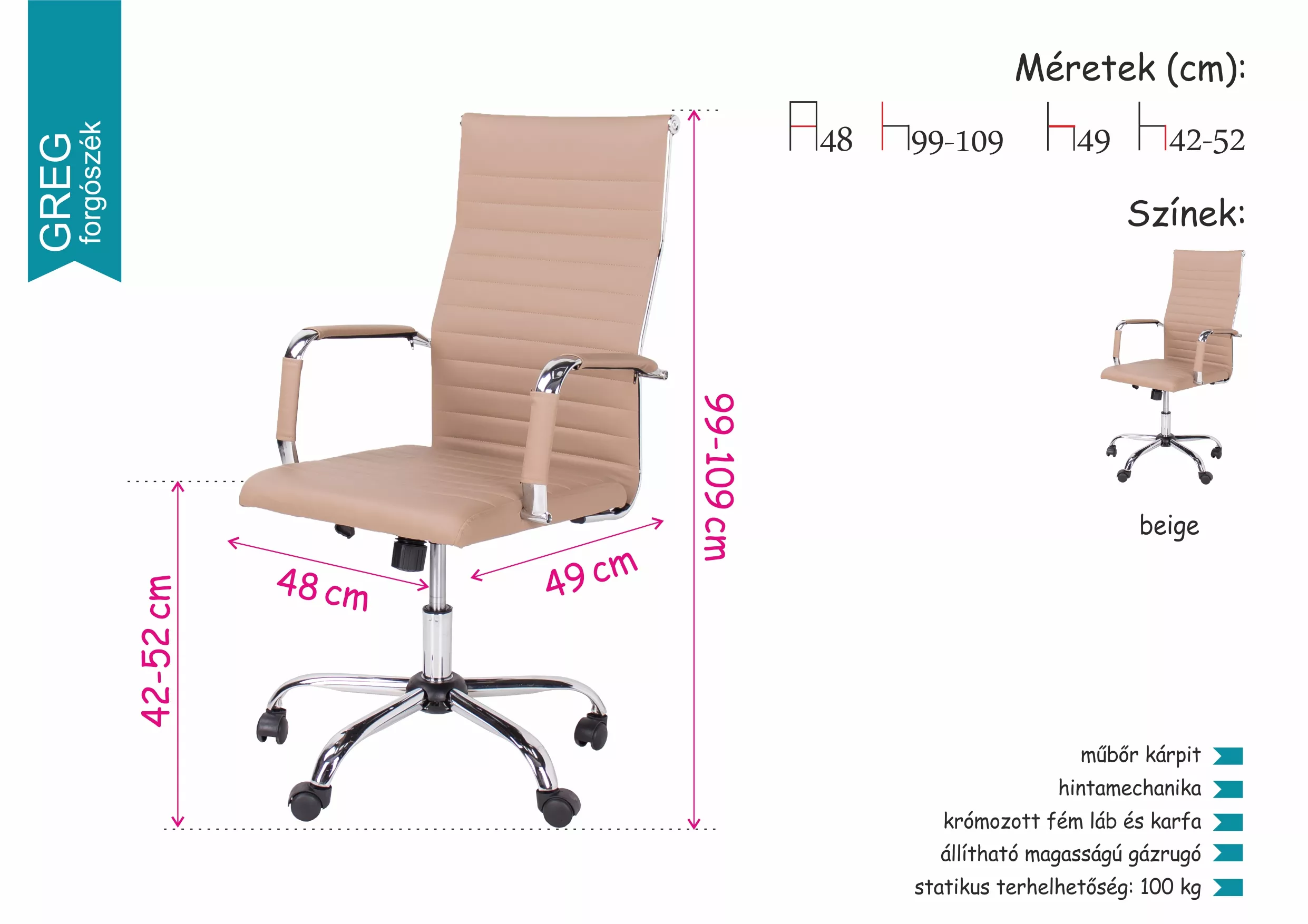 A beige színben kapható Greg forgószék műbőr kárpitjához remekül illik a krómozott fém láb és karfa. A hintamechanika és az állítható gázrugó a megfelelő kényelmet szolgálja. Tökéletes választás a mindennapokban az íróasztal mellett, legyen szó otthoni vagy irodai felhasználásról.
