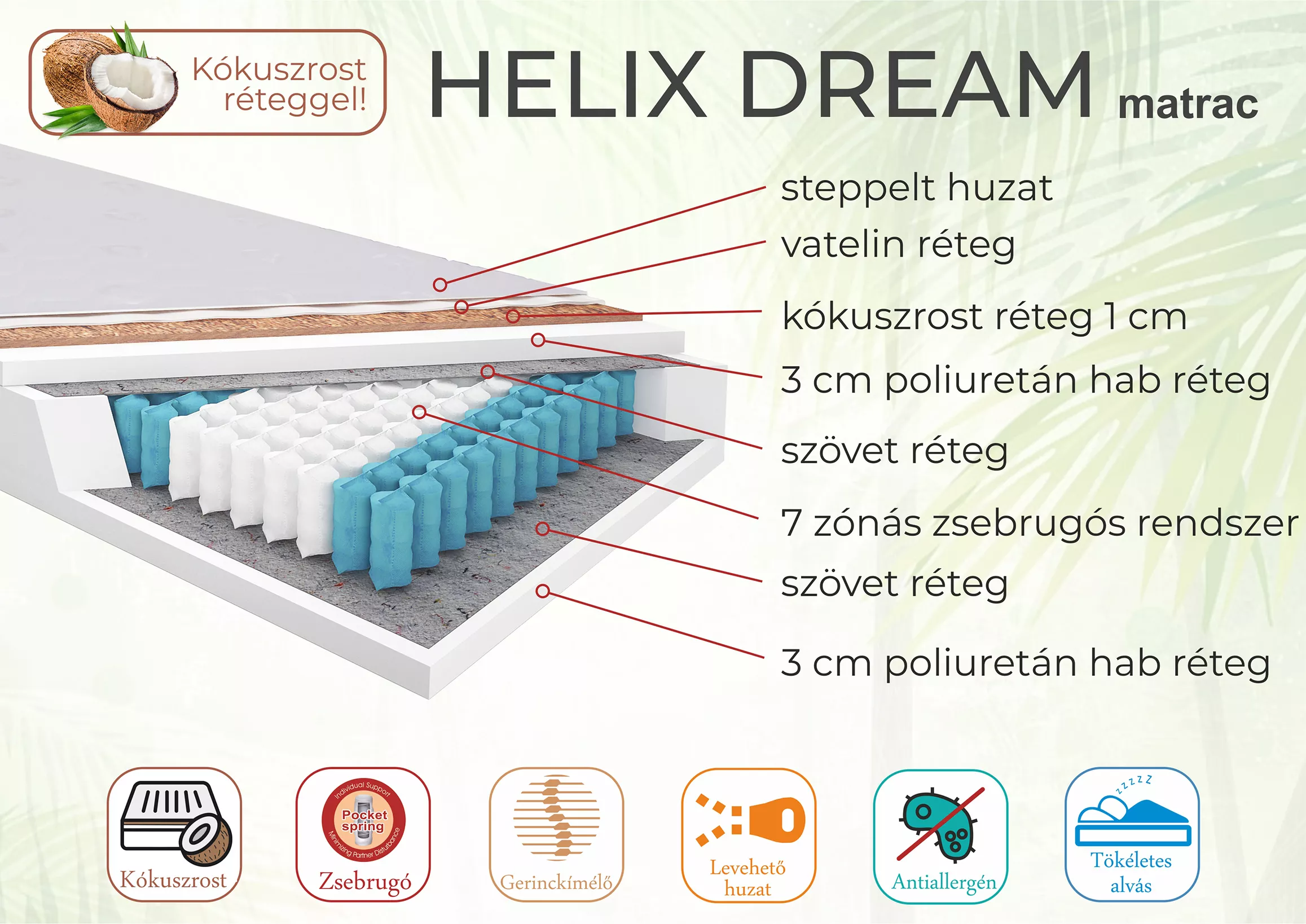 A Helix Dream matracot levehető, mosható steppelt huzat borítja. 7 zónás zsebrugós réteg és kókuszrost réteg jellemzi. Kétoldalas matrac, közepes keménységű oldalakkal rendelkezik. Antiallergén, hipoallergén.