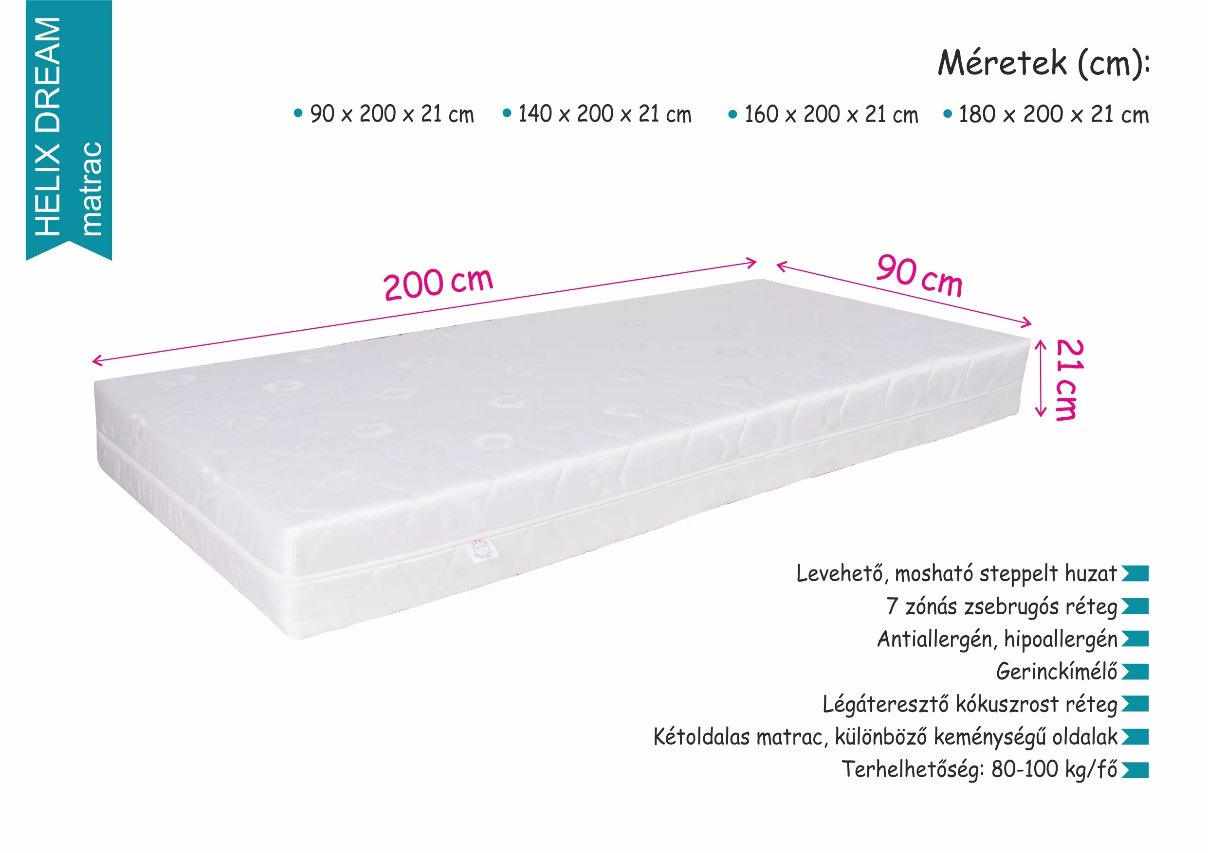 Fekvőfelület 1 cm kókuszrost réteg, 3 cm poliuretán hab réteg, 7 zónás zsebrugós rendszer