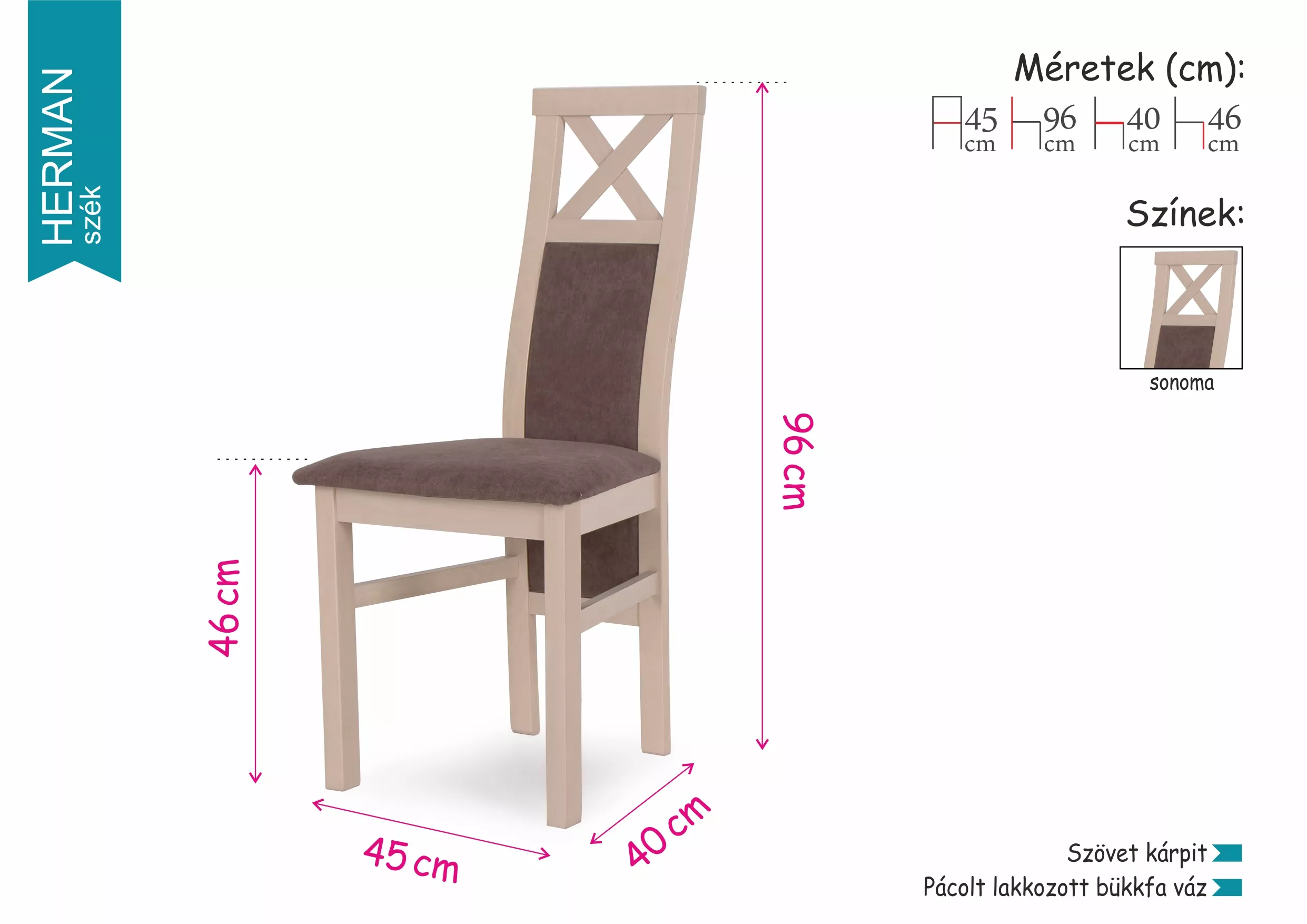 A pácolt, lakkozott bükkfa vázzal és szövet kárpittal rendelkező Herman szék kellemes barnás árnyalata igen népszerű a klasszikus stílusú étkezőket kedvelők körében. Enyhén ívelt háttámlájának köszönhetően kényelmes elhelyezkedést biztosít az étkezések során.