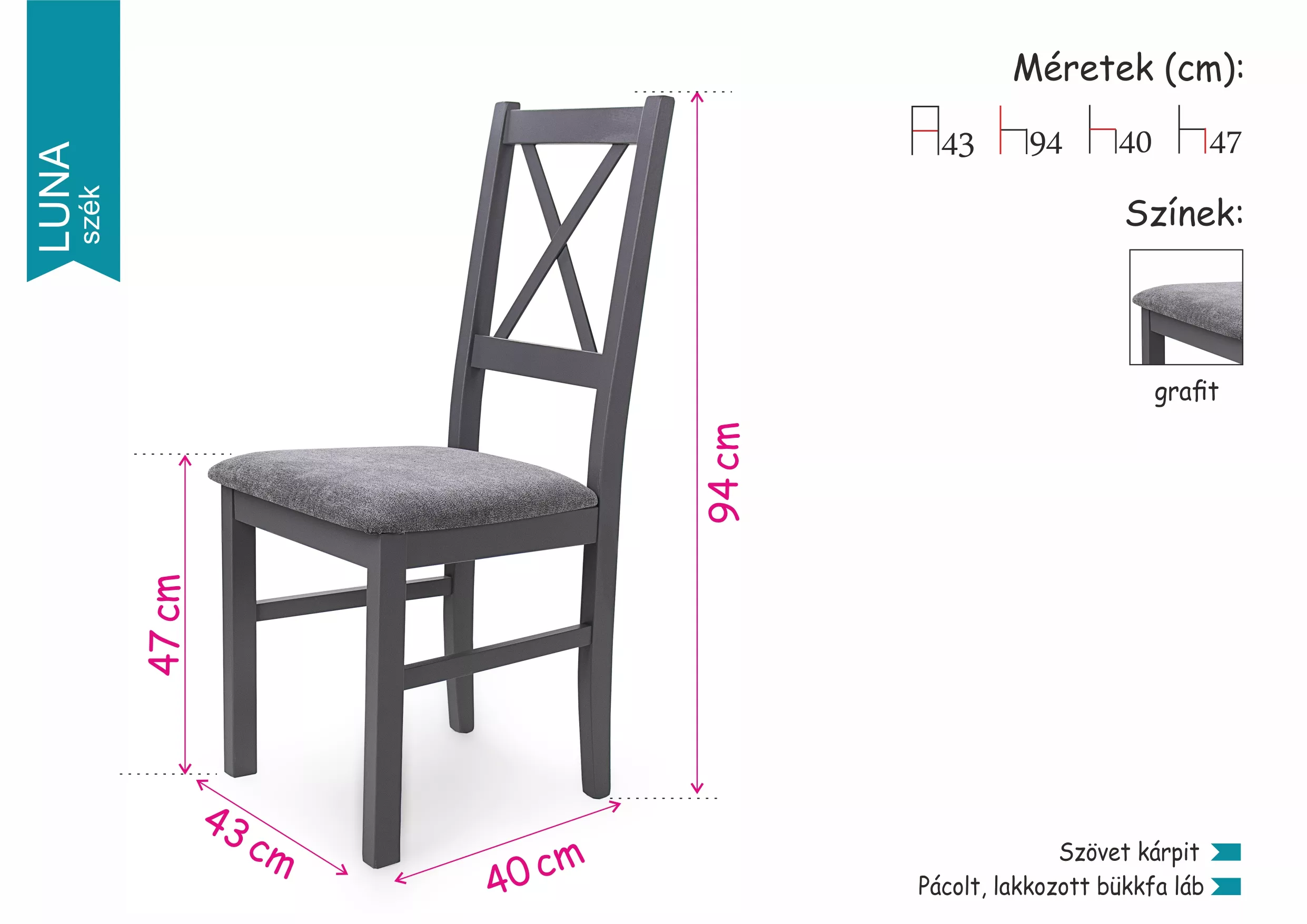 Határozott megjelenésével a Luna szék karakteressé varázsolja az ebédlőjét. Szürke szövetével az esztétika mellett a kényelmet is biztosítja. Pácolt, lakkozott bükkfa vázzal elérhető.