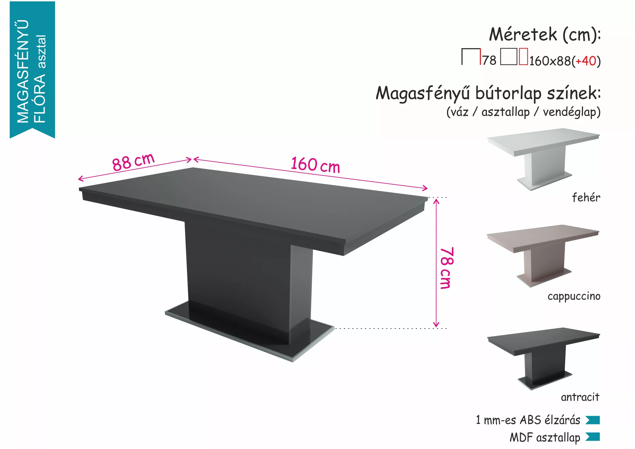 | Asztallap | MDF asztallap és 1 mm-es ABS élzárás |