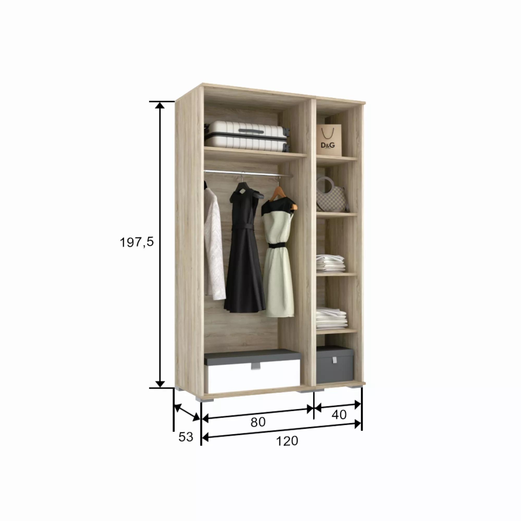 Bármekkora tér is áll rendelkezésedre, ruháid tárolására érdemes figyelmet fordítani. Bosszantó lehet, ha a reggeli rohanásban keresni kell a kedvenc pulóveredet vagy gyűröttnek találod a felvenni kívánt ingedet. Marina gardróbunk ideális választás kisebb terek kiegészítőjeként. Megfelelő mélységű akasztós, valamint polcos belső kialakítással rendelkezik, tökéletes elhelyezést biztosítva ruháidnak. A termék 18 mm-es laminált forgácslapból készül, ABS élzárással zárva, süllyesztett fejű forgácslap csavarokkal rögzítve. A hátfala 3 mm-es HDF lemez, tűzőkapcsokkal van rögzítve. A polcok fém polctartókkal rögzítettek. A gardrób 2 részből áll ( 1 db 80 cm-es polcos-akasztós, és 1 db 40 cm-es polcos). A termék 2 elemként készre szerelve kerül kiszállításra.