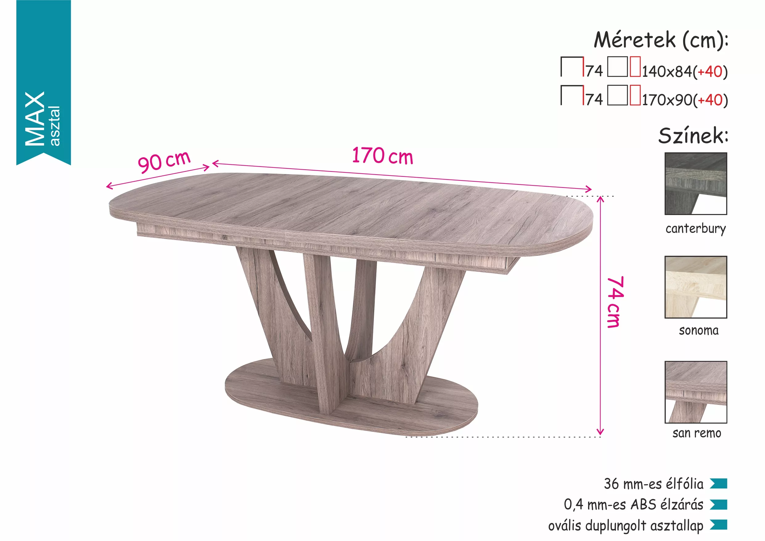 | Asztallap | Ovális, duplungolt 38 mm vastagságú asztallap |