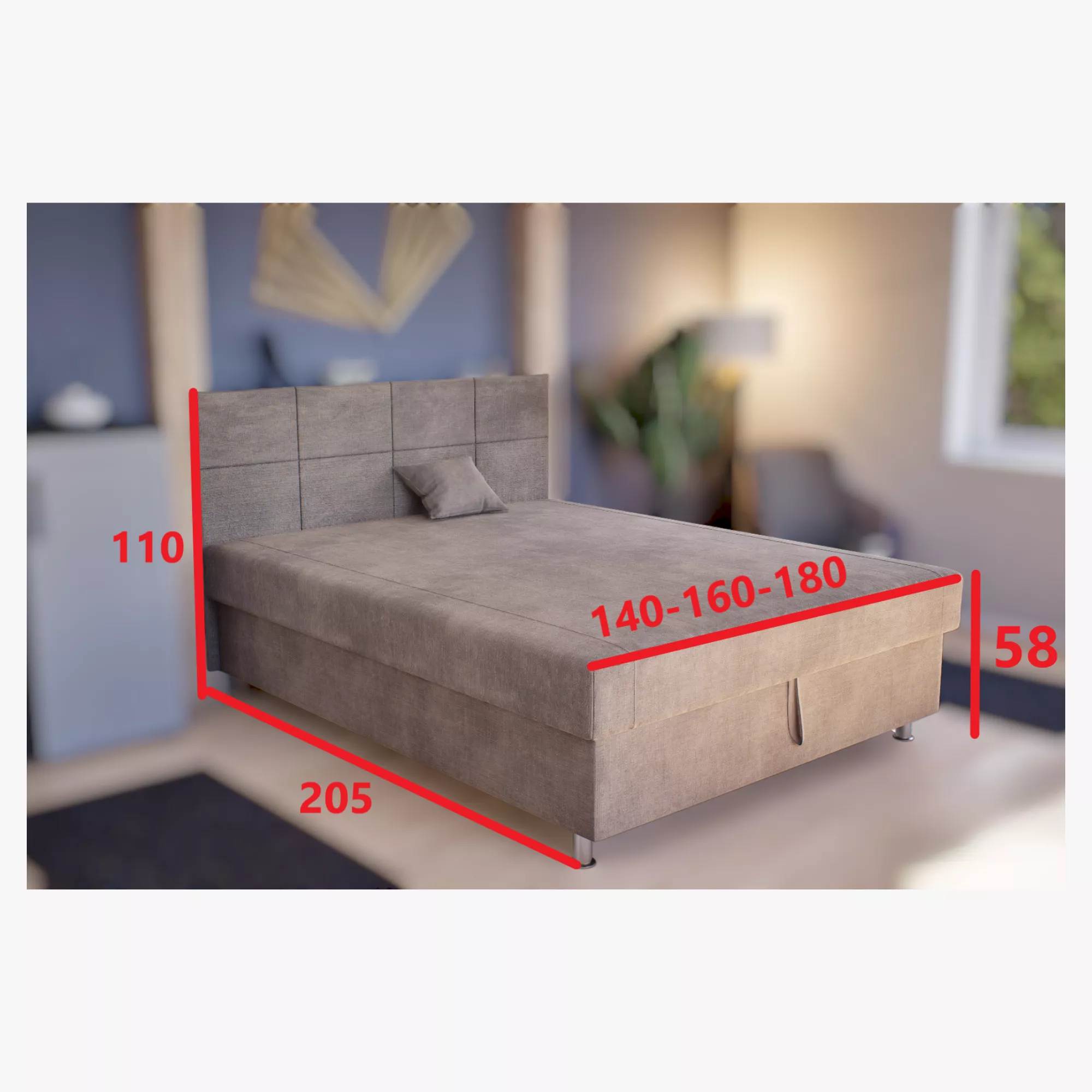 Méretek (160 cm): külső méret: 160 x 205 cm, fekvőfelület: 160 x 200 cm, fekvőfelület magasság: 58 cm, fejtámla magasság: 110 cm
