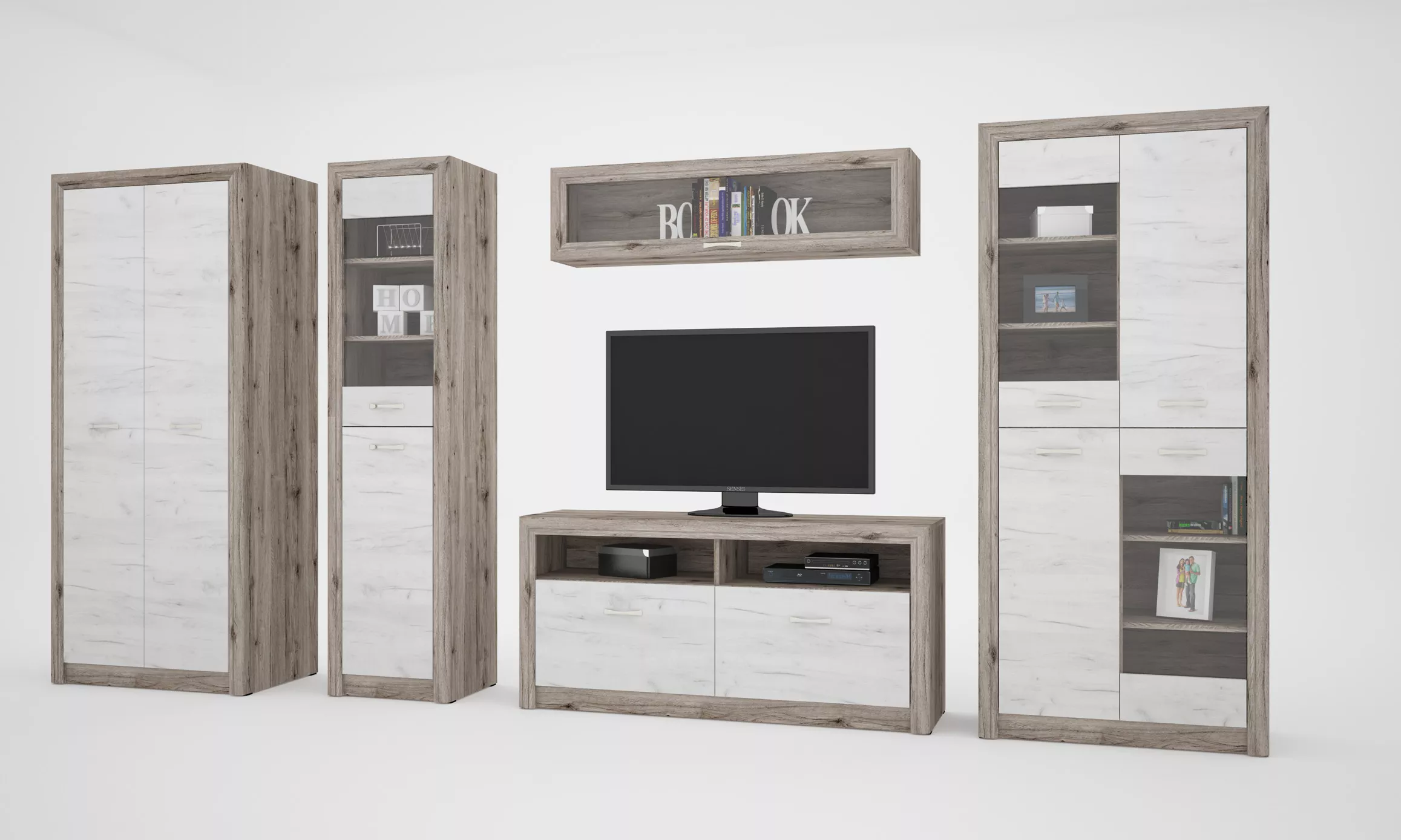 Remek lehetőségek, szabadon kombinálható, összeillő bútordarabok saját igényeid szerint elrendezve. Nem kell kompromisszumot kötnöd, rendeld kizárólag a számodra szükséges darabokat. 16 egymással harmonizáló elem közül tetszés szerint rendezheted otthonodat. Számos elképzelés könnyen megvalósítható, akár kisebb, akár nagyobb tér áll rendelkezésre. A bútortest színe san remo, az ajtó színe fehér tölgy.