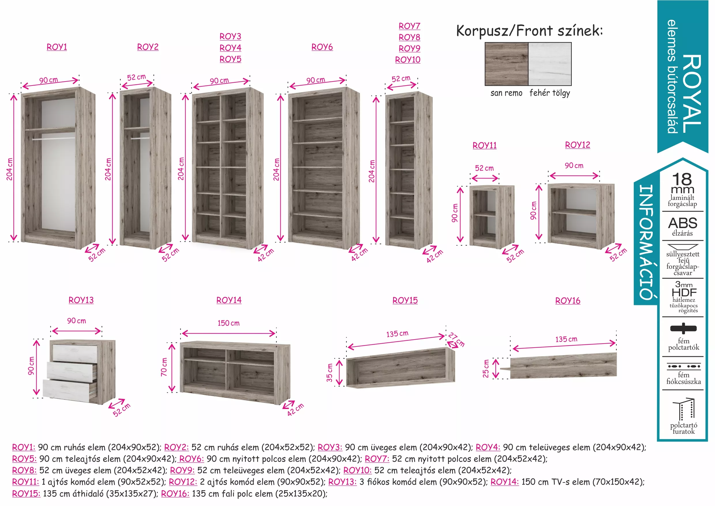 Remek lehetőségek, szabadon kombinálható, összeillő bútordarabok saját igényeid szerint elrendezve. Nem kell kompromisszumot kötnöd, rendeld kizárólag a számodra szükséges darabokat. 16 egymással harmonizáló elem közül tetszés szerint rendezheted be nappalidat, hálószobádat, de akár a gyerekszobát is. Számos elképzelés könnyen megvalósítható, akár kisebb, akár nagyobb tér áll rendelkezésre. A termék san remo színben elérhető.