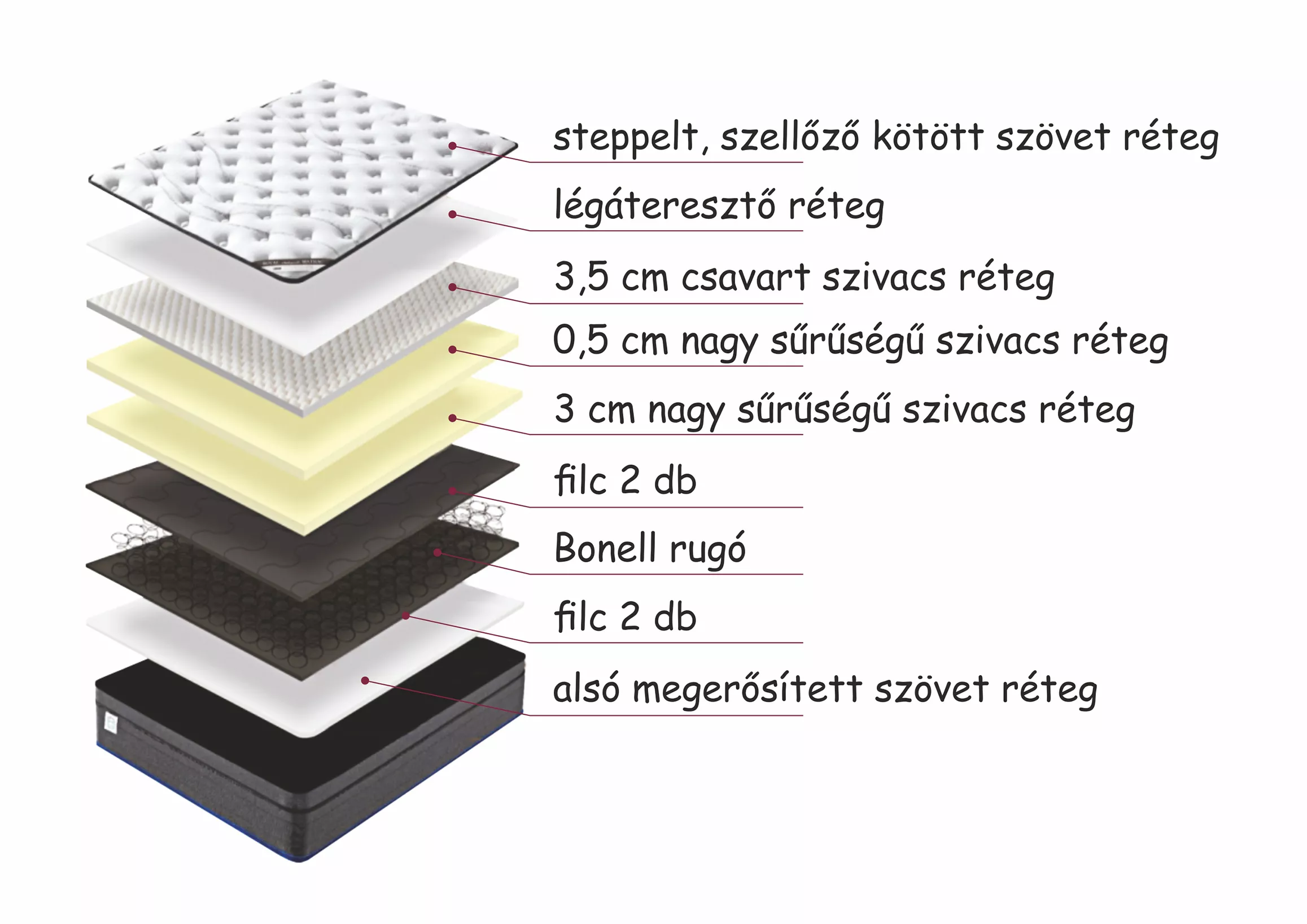 | Fekvőfelület | Steppelt,szellőző kötött szövet felső réteg |