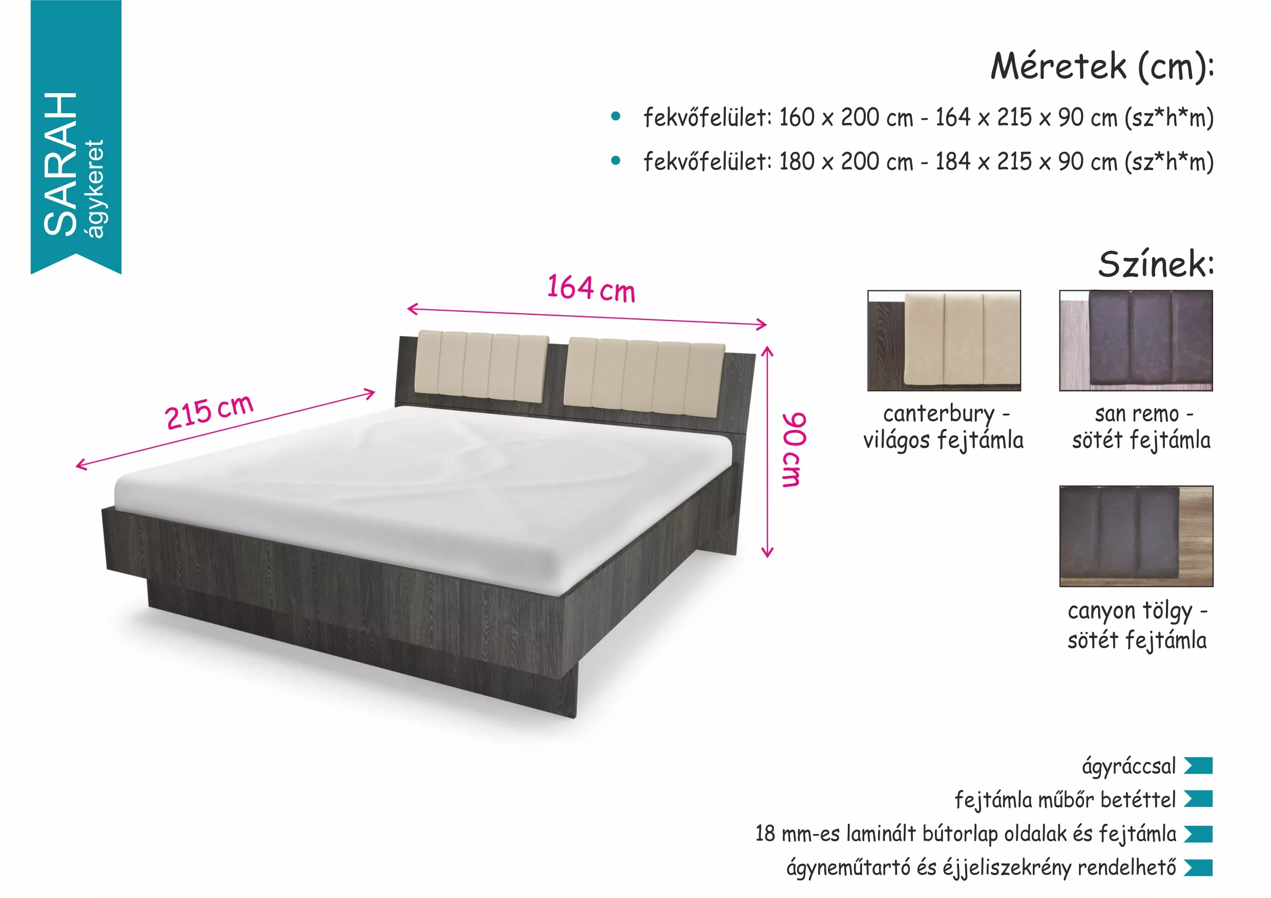 | Bútorlap | 18 mm-es laminált bútorlap oldalak és fejtámla |