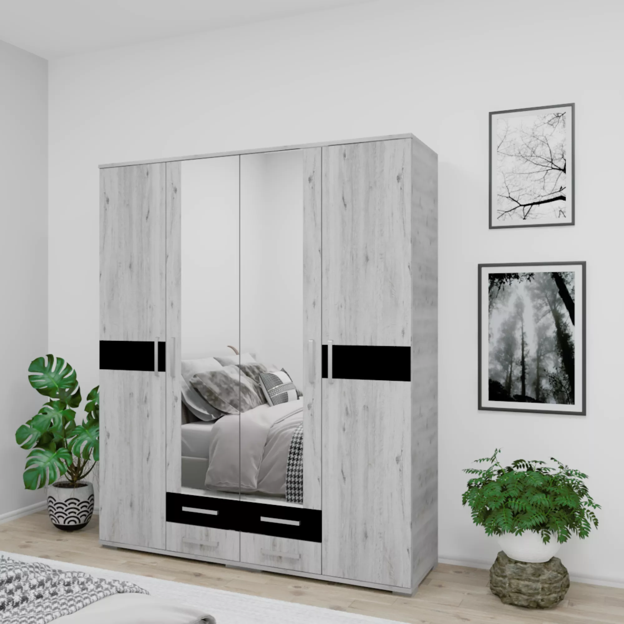 A Viktória bútorlapos gardróbszekrényünk modern, ajtós, tükrös, fiókos kivitelű. A termék 18 mm-es laminált forgácslapból készül. A hátfal HDF lemez tűzőkapoccsal rögzítve. Az ajtófront szintén laminált forgácslap, ABS élfóliával ellátva. Az ajtófronton magasfényű bútorlap betét található. Az ajtón lévő tükör csiszolt szélű, rögzített. A fogantyúk fémből készült króm színűek. A fiókok teljes kihúzású fém fióksínnel készülnek. A bútor 2 részből áll ( 1 db 80 cm-es elem polcos-akasztós, 1 db 80 cm-es elem polcos). A polcok alátámasztásai fém polctartóval vannak ellátva. A bútor elemekre szerelten kerül kiszállításra.
